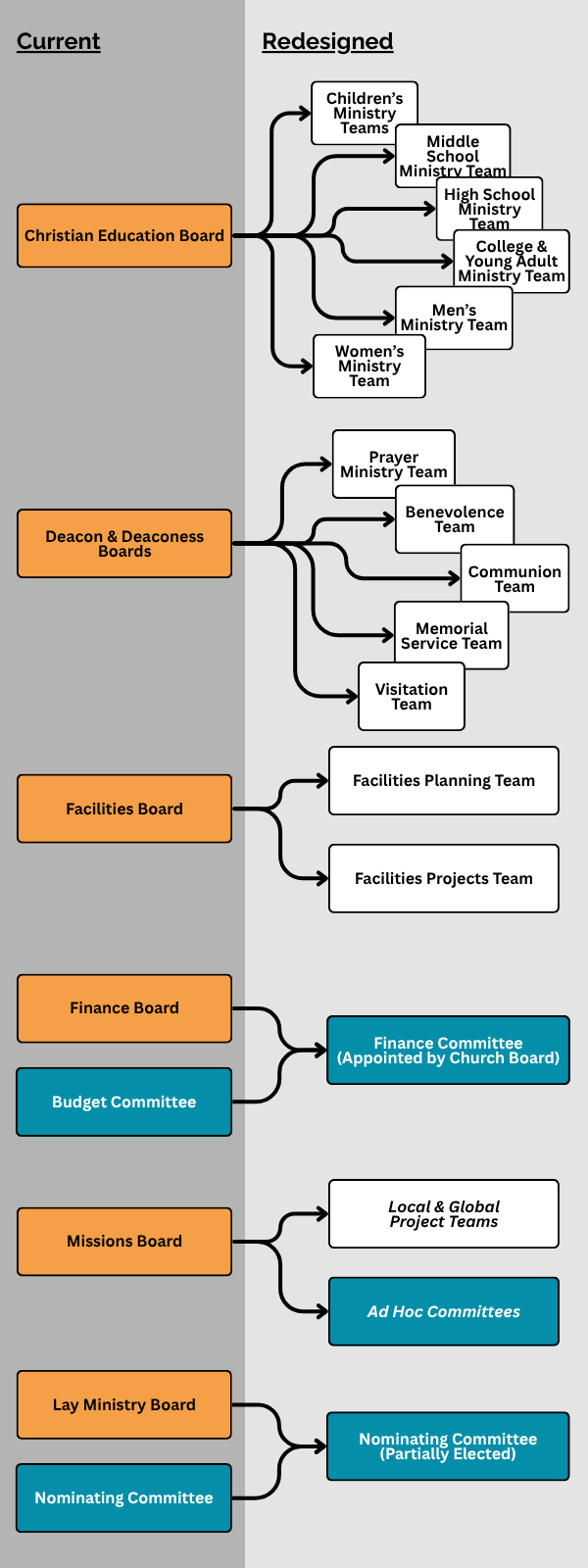 In no way do we envision the work of these important boards being left undone under the new structure. We expect the Church Board, staff, and congregation will work together to define various Ministry Teams or Committees as appropriate to continue the important functions of these boards, just as critical children’s, youth, senior, and worship ministries (among others) continue now without formal board oversight. While this will most likely create additional oversight functions for the Church Board members, it will provide desired flexibility to the staffing of these Ministry Teams and Committees that can be “right sized” in proportion to current, respective needs for the church.